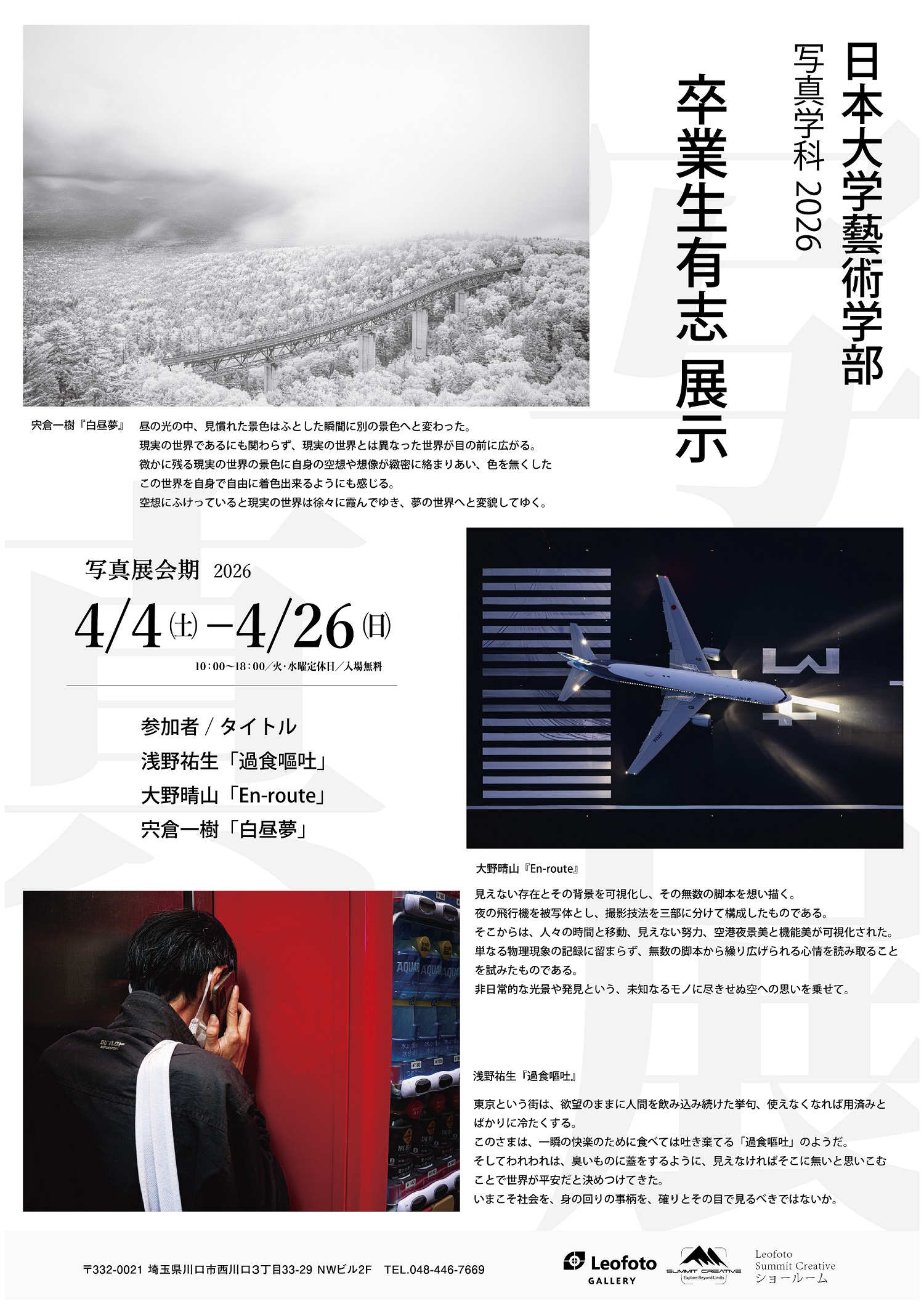 4/4(土)~4/26(日)にLeofoto/Summit Creativeショールームにて日本大学藝術学部写真学科 2026年卒業生によるグループ展を開催致します。